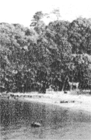 白浜湯崎観光協会・昭和16年5月20日発行「熊野観光と白浜湯崎」は昭和15年5月20日発行もあり、この白良浜の写真は掲載されていません。また、この写真のカットしていない原板には、人物が黒く撮影されているところから昭和16年冬から春先に撮影されたと思っています。 銀砂湯の噴出が見えません。 熊野三所神社の鳥居、写真向って左に白く小さい建物が見えます、その前に「みわの湯」があります。
